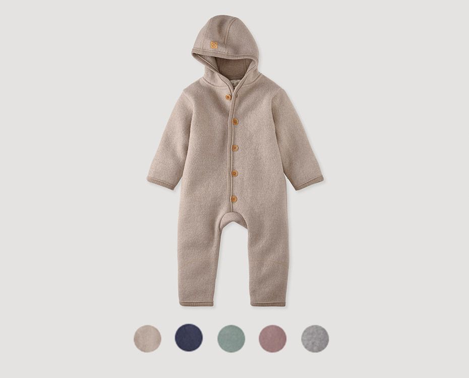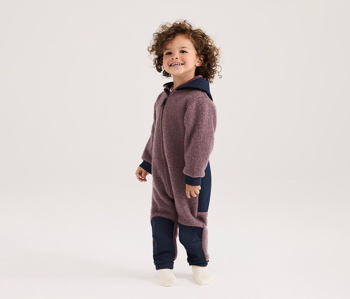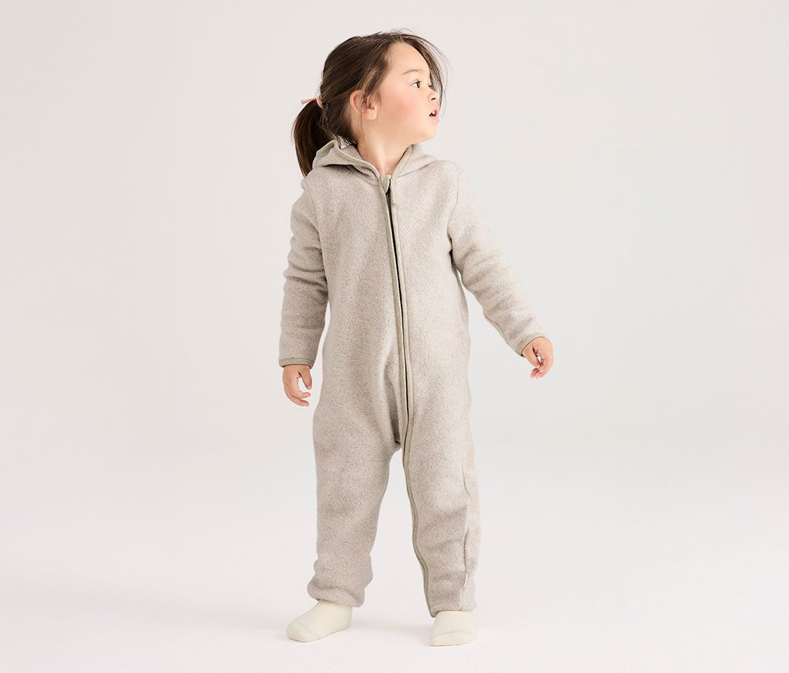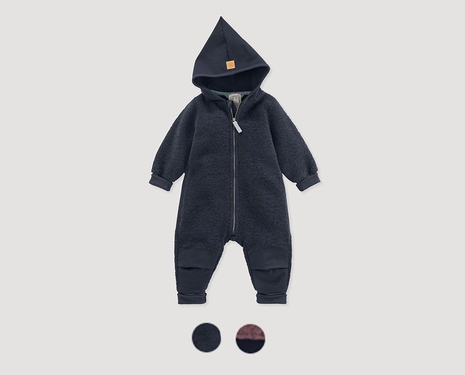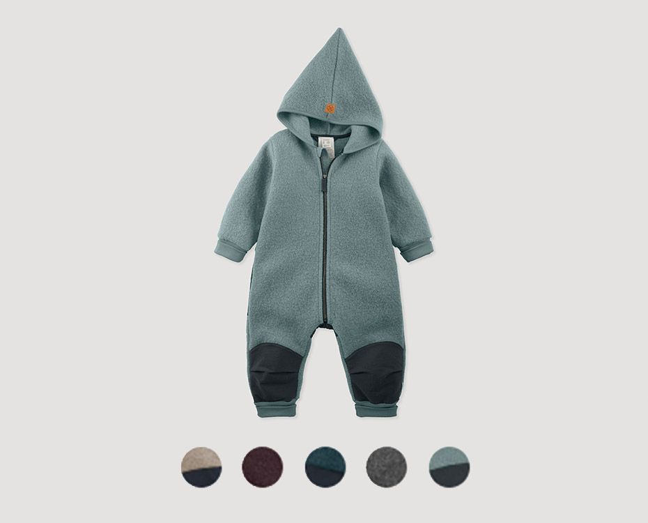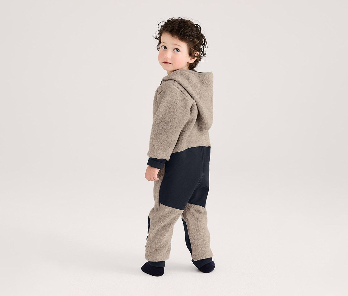Highly recommended by parents and kids: our organic overalls. Breathable and warm, made from organic cotton and organic merino wool. Completely free of microplastics. Now with patches made from natural softshell for even greater durability. Fairly produced without harmful chemicals.