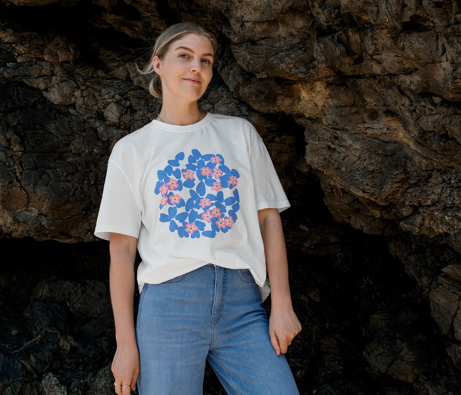 Versatile favorites: Oversized T-shirts featuring Liv Lee designs on the front and back. The organic cotton used for the loose-fitting jersey comes from the farming project through which we’re making a difference in Greece.