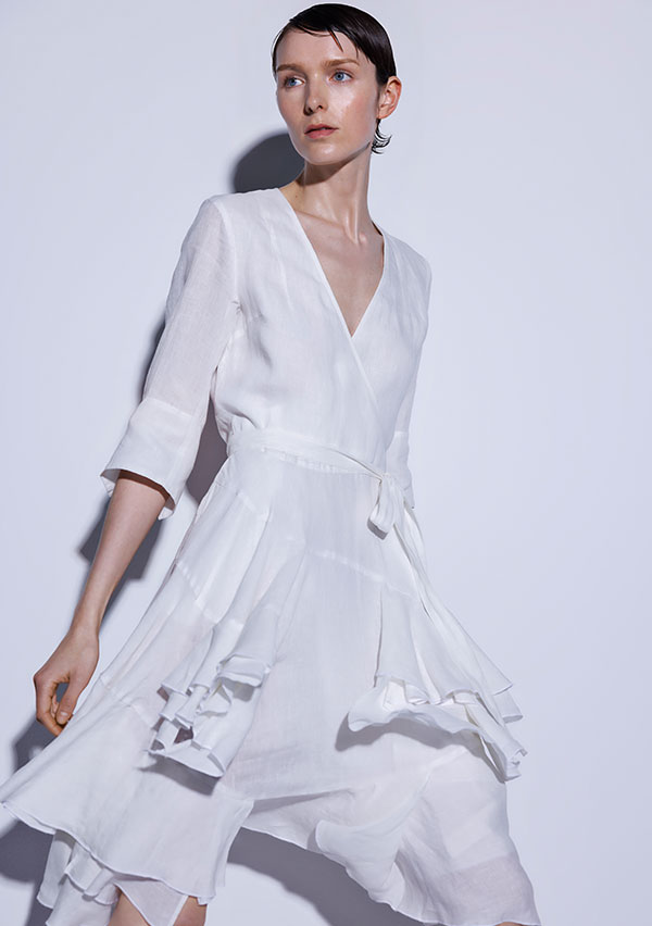 Asymmetrisches Wrap-Kleid: Mit Volants und Wickelband. Aus reinem Leinen, das angenehm kühlt.